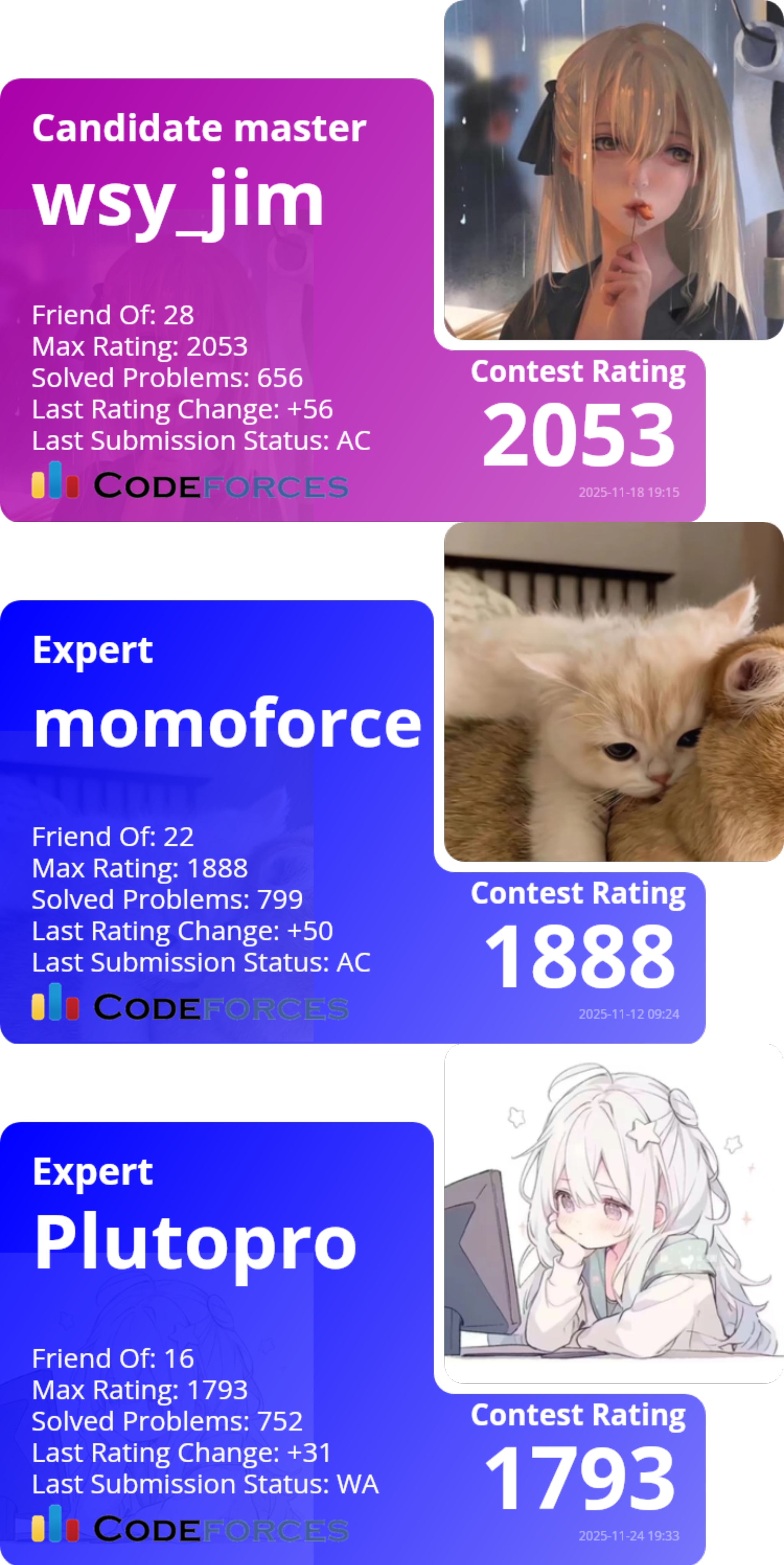 早晨被拉起来吃早饭。去武大报道,领了衣服参赛牌餐券和蒜鸟🐦,拍了滚榜照片(最后也没放),给 momo 和 plutopro 记录了下投壶的拉稀瞬间,抽奖抽了几个谢谢惠顾,随便领了几个钥匙链。发现 cjb 但是没敢上前要 ucup 吧唧。武大最好的食堂蛮好,但是人太多,找了个人少的窗口吃。下午热身赛,开局写了 a+b 缺省源,momo 写了矩阵构造,然后我抢断 plutopro 模拟神写了按位交互,开始测机子,测到 1s 跑 3e8 然后结束了。晚上选了一场牛客寒假想来把信心赛,但不幸 momo 遇到假题,猛猛贪心+dp喜提四个 wa,我见状猛猛贪心,喜提四个 wa,最后发现 std 都过不了 momo 造的强样例,鉴定为假题,plutopro 遇 corner case 构造,喜提七个 wa,骂骂咧咧写了一晚上。我的板子输出为 pdf 不小心背景输出成纯黑,打印店老板也是个实诚人,给打印店打印得墨没了,才换成浅色背景打。笑断气了。